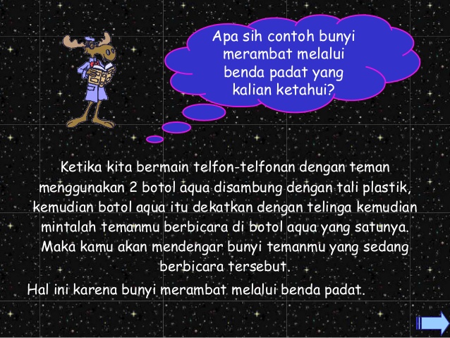 Bunyi Dapat Merambat Melalui. Akan tetapi, bunyi tidak dapat merambat pada ruang hampa. Adanya sifat itu, komunikasi antara orang yang ada di atas kapal dan penyelam dapat dilakukan sehingga pencarian korban dapat berjalan lancar.