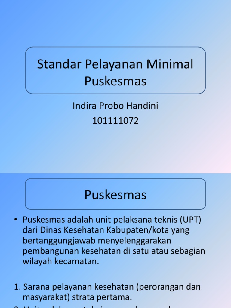 Standar Pelayanan Minimal Puskesmas. Silahkan kunjungi postingan Standar Pelayanan Minimal Pendidikan Dasar untuk membaca artikel selengkapnya dengan klik link di atas. Standar Pelayanan Kefarmasian di Puskesmas meliputi standar:.