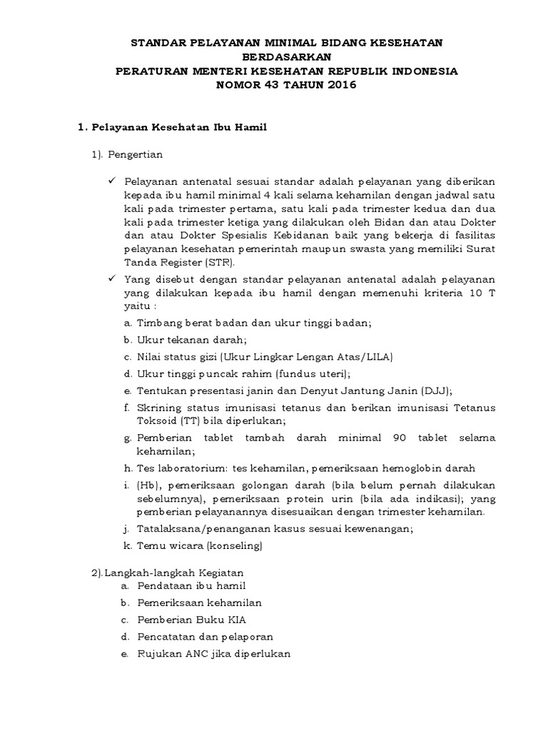 Standar Pelayanan Minimal (SPM) merupakan salah satu cara yang ditempuh untuk mendorong pemerintah daerah melakukan pelayanan publik yang tepat bagi masyarakat, dan sekaligus mendorong masyarakat untuk melakukan kontrol terhadap kinerja pemerintah di bidang pelayanan. dan Masa Sesudah Melahirkan, Penyelenggaraan Pelayanan Kontrasepsi, serta Pelayanan Kesehatan Seksual diselenggarakan dengan pendekatan promotif, preventif, kuratif, dan rehabilitatif yang dilaksanakan secara menyeluruh terpadu dan berkesinambungan.
