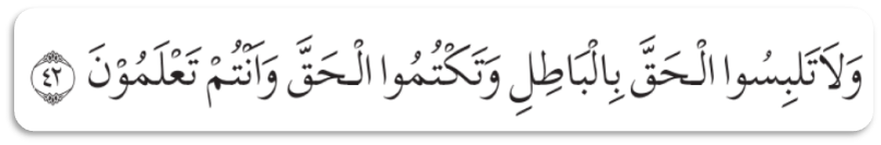Dan janganlah kamu campuradukkan kebenaran dengan kebathilan dan (janganlah) kamu sembunyikan kebenaran, sedangkan kamu mengetahuinya Sementara dalam kitab Tafsir Ibnu Katsir, Imam Qatâdah rahimahullah berkata, "Janganlah kalian campur-adukkan agama Yahudi dan.."Dan janganlah kamu campur adukkan kebenaran dengan kebatilan dan menyembunyikan kebenaran, sedangkan kamu mengetahuinya." Menyembunyikan kebenaran juga dilarang dalam Islam.